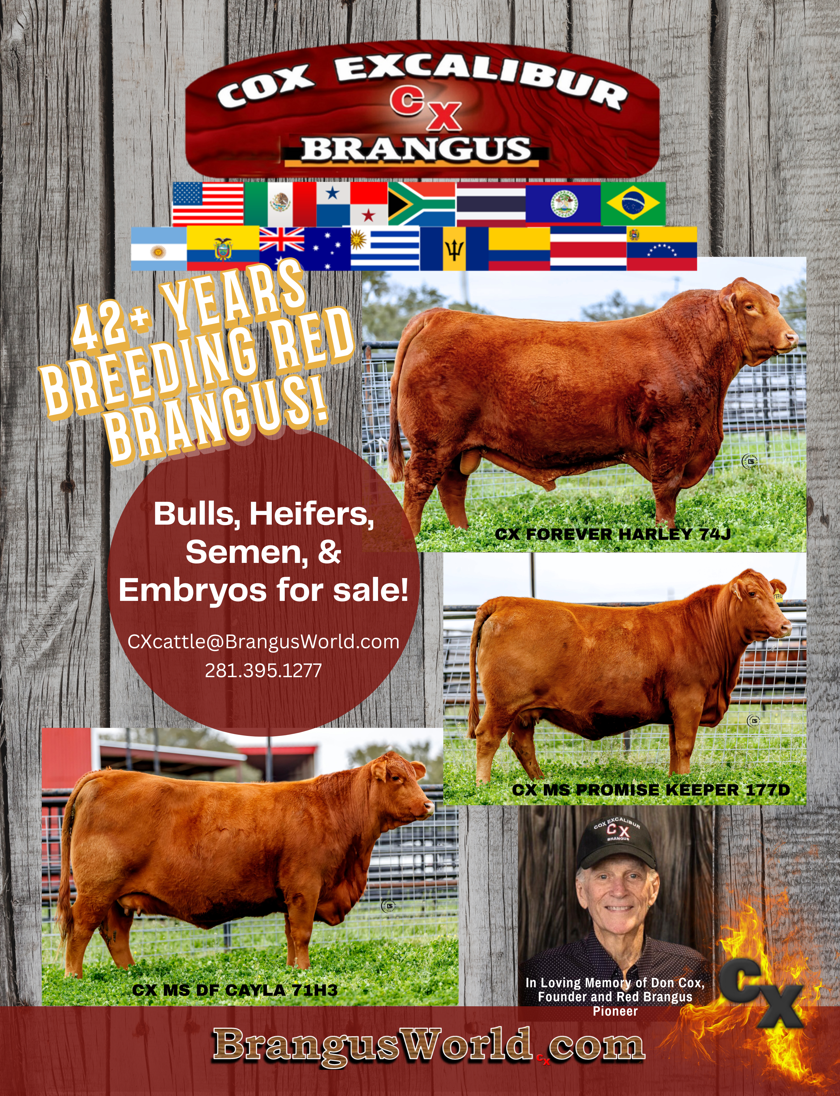 Cox Excalibur has been in business for over 40 years. Don Cox started the CX herd in 1983 on his ranch in Weimar, Texas. Weimar is about 70 miles west from the city of Houston, Texas. Don worked hard to build a top quality herd by testing different genetics to develop the herd now known as Cox Excalibur Red Brangus or CX Genetics. Don’s legacy will continue to guide CX for years to come.